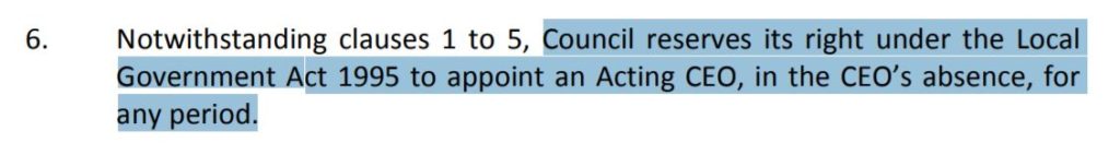 The policy in question gives the CEO the right to choose which Director acts as acting CEO when the CEO is on leave for more than 5 consecutive days, but less than 4 weeks. The amended City of Perth policy, as detailed in last night’s agenda (27 Feb), is similar to the existing policy, except it has a catch-all :